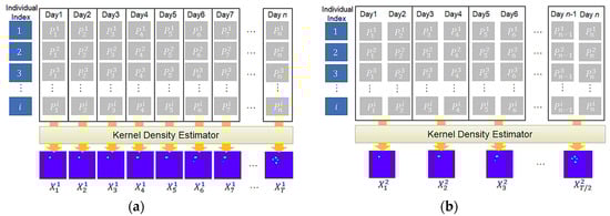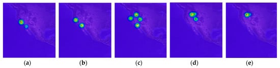 To predict animal movement over time, we first need to generate a sequence of kernel density images from collected geo records. In the experiment, we considered 10 different cases depending on how to group geo records, how many days to consider as input, and how many days to predict as output. For instance, in Figure 8, represents one collected geo record and indicates an individual of a particular animal species, E. For each group of geo records, the KDE generates one density image. For instance, Figure 8a,b shows a sequence of density images generated for a sequence of daily and two-day geo records, respectively. To see the effect of grouping size, we consider five different grouping sizes, which are 1, 2, 3, 7, and 15. After generating movement density images, we use them as an input for our predictive RNN. Table 2 shows an outline of the experiments.