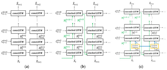 Structural differences of (a) convolutional stacking LSTM; (b) PredRNN; (c) PredRNN++.