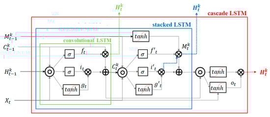 Equations (2)–(7) present the operating of cascade LSTM, where and indicates the operator of the convolution and the Hadamard product, is the Sigmoid function. The square brackets present concatenation of each tensor. The PredRNN++ used convolutional filters , where and has one by on convolution filer. The basic equations derived from standard LSTM [43] and the difference of standard LSTM and PredRNN++ is number of hyperbolic tangent layers and existing spatiotemporal memory cells. Equations (2) and (3) present standard LSTM gates operating equations, and Equation (4) is spatiotemporal gates update equation regulated by previous spatiotemporal memory, , and current state, . Equations (5) and (6) shows current spatiotemporal memory, , update operation. Final output, , is computed based on dual memory states and .