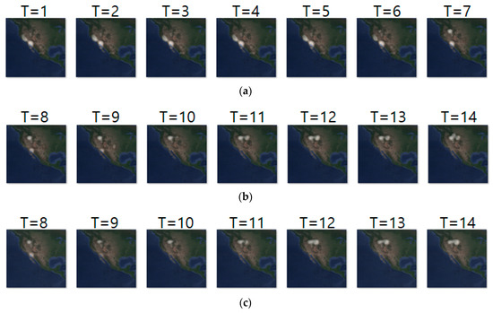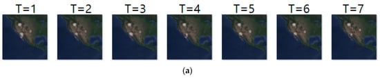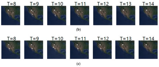 Likewise, Figure 11a–c shows the input sequence, ground truth sequence and predicted sequence of case 4, respectively. The input and ground truth sequences indicate the migration movement of long-billed curlews from 7 February 2018 to 9 May 2018. In the case 4, we generated one movement density image for geo records of seven days. In the figure, we can see three states of migration: non-breeding season movement shown at T = 1 to 6, migration beginning shown at T = 7 to 10 and migration ending shown at T = 11 to 14. Table 13 shows the daily comparison of RMSE, SSIM, and centroid distance.