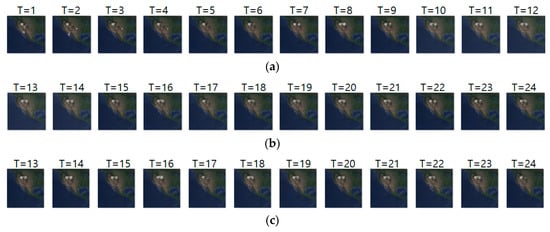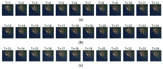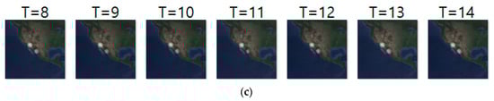 Figure 13a–c shows the input sequence, ground truth, and predicted sequence of case 9, respectively. The input and ground truth sequences show the migration movement of long-billed curlew from 16 November 2017 to 3 May 2018. In Figure 13a,b, we can see the starting migration movement at T = 14, pre-breeding migratory and migration for breeding at T = 15 to 18, and migration ending at T = 19 to 24. Table 15 shows daily comparison of RMSE, SSIM, and centroid distance in case 9. In this experiment, the input sequence showed a static movement and the ground truth sequence showed a dynamic movement pattern from T = 15 to 18. However, our model did not predict such dynamic movement precisely.