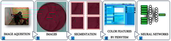 Scheme of color features which were extracted from the image to the learning process of Neural Networks: (a)—taking pictures using the research stand; (b)—creating of base of digital photos of chokeberry fruit powders; (c)—image segmentation; (d)—1—image processing module in “PID system”, 2—loading images in the “PID system”, 3—batch image processing selection, 4—determination of image coordinate values (x, y) to be cropped, 5—selection of image format, 6—selection of image pattern to change the name, 7—files list, 8—saving images to the destination directory, 9—extracting color characteristics from images (RGB, YCbCr), 10—approval of the processing process, 11—cleaning the list of objects from the file list window, 12—creating Laws masks, 13—creating Kirch masks, 14—creating Prewitt masks, 15—creating GLCM script to Matlab, 16—creating convolution mask, 17—loading “.csv” file, 18—saving “.csv” file; (e)—learning process ANN.