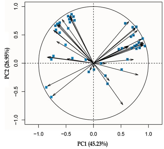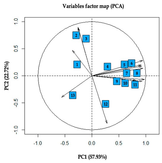 PCA of shape factors: 1—Malinowska factor 2—aspect ratio (AR), 3—Feret factor, 4—Feret diameter X, 5—height, 6—width, 7—W2_circumference 2, 8—perimeter, 9—W1_circumference 1, 10—Feret diameter Y, 11—Area,12—Round, 13—Solidity [10,46].