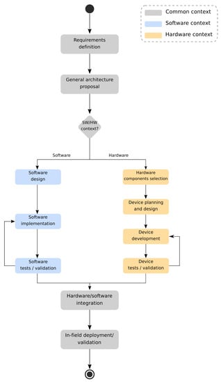 - Hardware/software integration: This part encloses the integration of previously developed hardware and software parts. This is a mandatory step, once both of these parts were independently developed until here. Basic and composed functionalities can be evaluated, verifying whether they provide the expected output or not; and