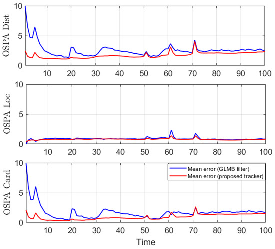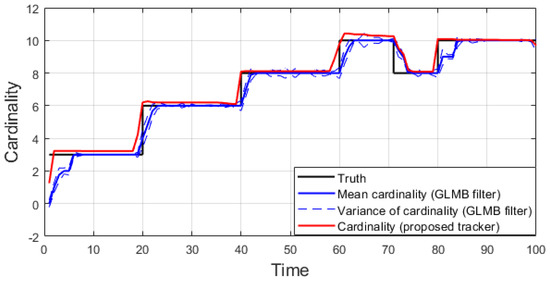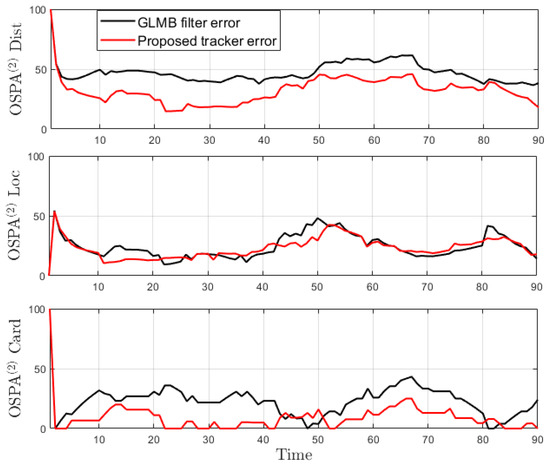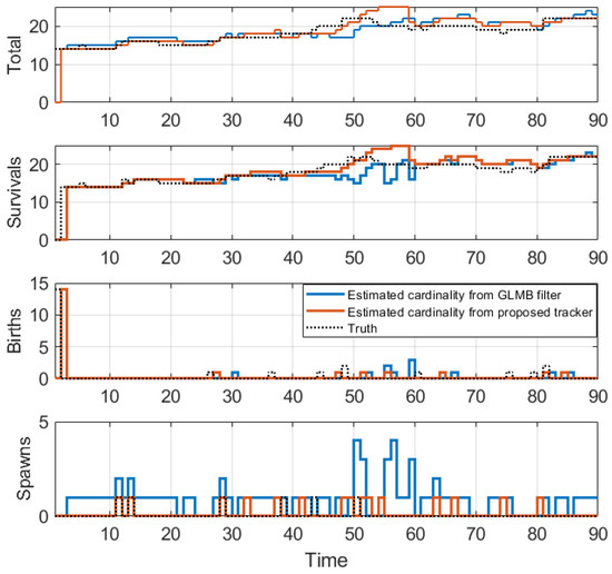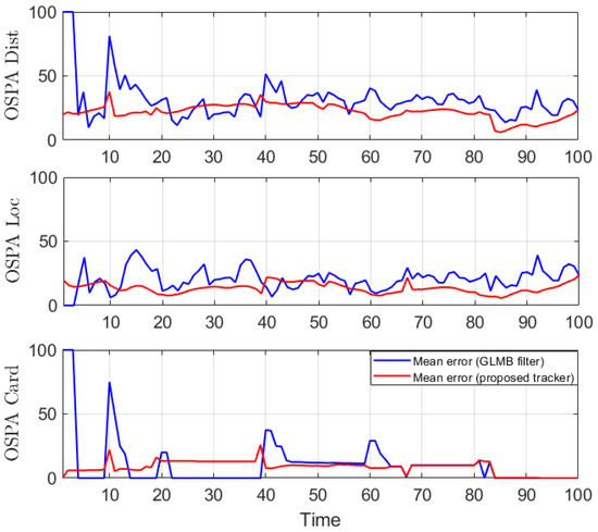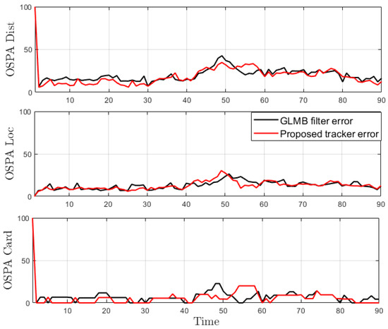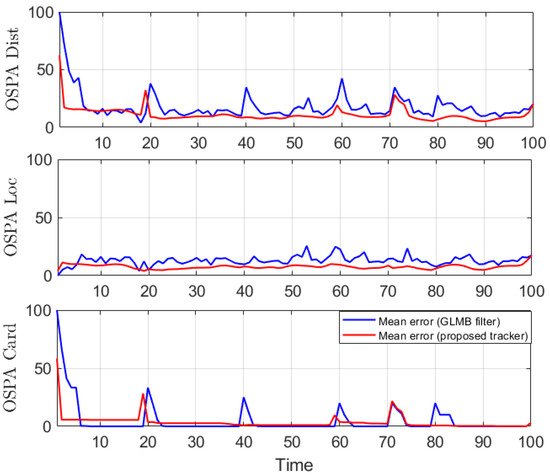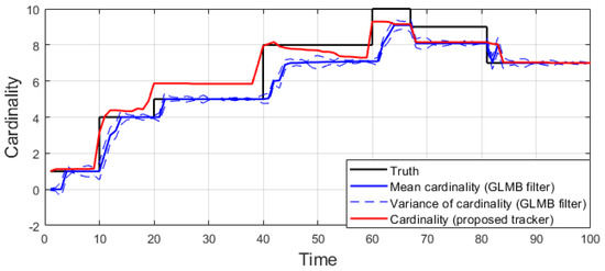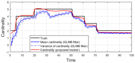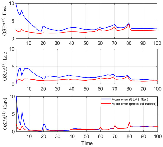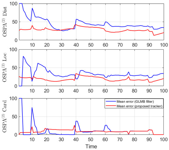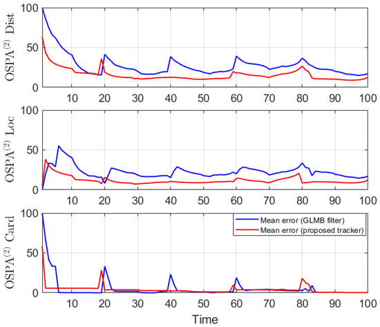 We conduct the experiment over 100 Monte Carlo runs. The means of the estimated Optimal Subpattern Assignment (OSPA) error [55] and OSPA2 error [52,56] are given respectively in Figure 2 and Figure 3. Figure 4 shows the GLMB filter and proposed tracker-estimated cardinality of objects set for each time step along with the true values.