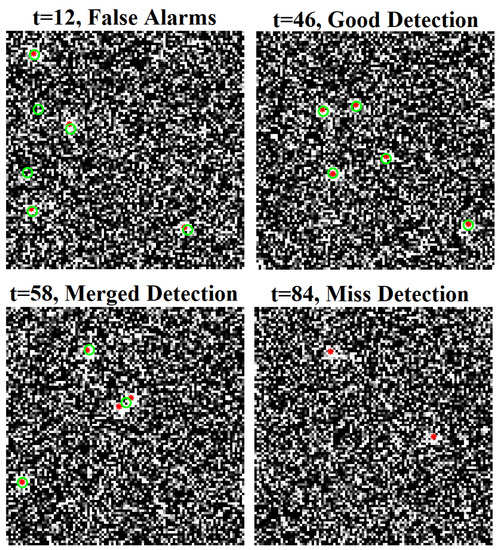 The dynamic model and standard observation model are similar to the ones in Section 4.1.1 with pixel/s, , and pixels with a clutter rate of 10. The expected new births states are , , , , and with the covariance of and the probability of . The ground truth location of objects is shown in Figure 9 while Figure 10 shows samples of raw image observation along with points detection. The implementation of the filtering phase is as the same as in Reference [27]. The smoothing interval is set to the entire tracking time with the track pruning threshold of the smoother set to 3 time steps.