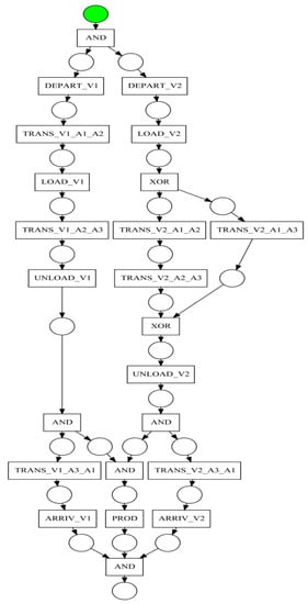 The results obtained after the action recognition and instance identification steps can be used to compile an event log, referring high-level activities instead of low-level events. The activities can be subsequently used as the input for the process model discovery step. Given the availability of additional information regarding the concurrent execution of some of the activities (derived from the set of action models used in the recognition step), the study focused on methods capable of using this knowledge. As such, a method based on building event structures followed by folding them into Petri Nets, was used to generate a process model. An example of a process model is described in Figure 6. Some aspects of the process model such as “AND” and “XOR” blocks need to be further analyzed and modeled with the aid of a higher level Petri Net formalism. The system implementation was used to validate the proposed approach in a case study built around a simulated logistic process.