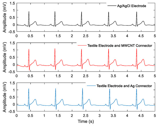 - Simultaneous synchronized ECG recording with gel electrodes and the sensorized garment using the MWCNT connector;