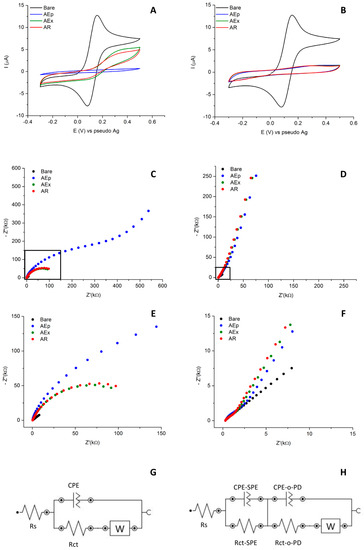 Electrochemical characterization study of imprinted (MIP) and non-imprinted (NIP) polymers at gold screen-printed electrode (Au-SPE). Cyclic voltammetry (CV) and Nyquist plots obtained after each step of the modified protocol for MIP ((A,C), respectively) and NIP ((B,D), respectively). The CVs were scanned at 50 mVs−1, while EIS spectra were recorded with an amplitude of 0.01 V and a bias potential determined by open circuit potential (OCP). All measurements were performed in 0.5 mM FcCOOH, 0.01 M ammonia buffer (pH 8.4). Zoom in of the Nysquit plot for MIP (E) and NIP (F) and equivalent circuits used to fit the EIS data (G,H). The abbreviations used in the legend indicate the following steps: Bare, unmodified Au-SPE (in black); AEp, after electropolymerization (in blue); AEx, after template extraction (in green); AR, after target rebinding (in red).