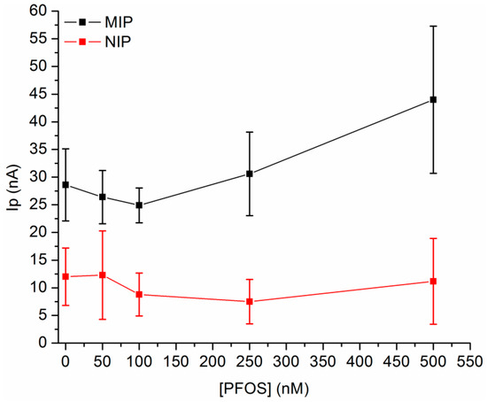 Calibration plots of imprinted (MIP, black) and non-imprinted (NIP, red) polymers at gold screen-printed electrodes obtained after the rebinding of 0, 50, 100, 250 and 500 nM of PFOS. The signal were recorded by DPV in the potential window between 0.0 V and 0.5 V vs. pseudo Ag, with a pulse width of 25.0 ms, a pulse amplitude of 25.0 mV, an increment potential of 4.0 mV and a scan rate of 20 mVs−1 in 0.5 mM FcCOOH, 0.01 M ammonia buffer (pH 8.4). The values presented are the average of three measurements and the error associated to the standard deviation.
