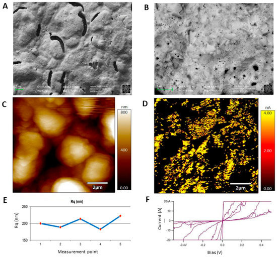 Surface characterization of unmodified gold screen-printed electrode imaged with: field-emission scanning electron microscopy (FE-SEM) at 9.16 kx using secondary electrons (A) and 40 kx using backscattered electrons (B), both at 20.00 kV; atomic force microscopy (AFM) topography (C) and conductivity (D) modes. AFM correlated graphs showing the roughness (E) and the conductivity (F) measured in different points.