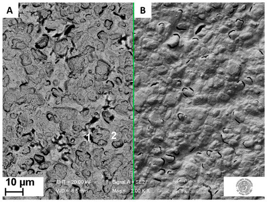 The MIP distribution after polymerization was investigated with backscattered and secondary electrons. By comparing the images of the same area obtained with these two signals it was possible to recognize the polymer distribution. Due to the dependence of backscattered electron (BSE) signal to the average atomic number Z of the sample material hit by beam (primary) electrons [9,10], in BSE micrographs the polymer is darker than higher-Z areas, like bare gold ones. On the other hand, the secondary electron (SE) signal is much less sensitive to the average atomic number [26,27]. Therefore, in BSE images it was possible to recognize areas richer in polymer with respect to the surroundings as dark areas. However, each dark area cannot be identified as a polymer, because also holes on the bare electrode surface appear dark; nonetheless they also appear dark in SE images, and this allowed to discriminate which dark areas in BSE micrographs were holes and which were not. With this approach, the comparison of BSE (Figure 4A) and SE (Figure 4B) of the same area of the sample highlighted the presence of low-Z areas, which reasonably were polymer areas (due to the nature of the sample).
