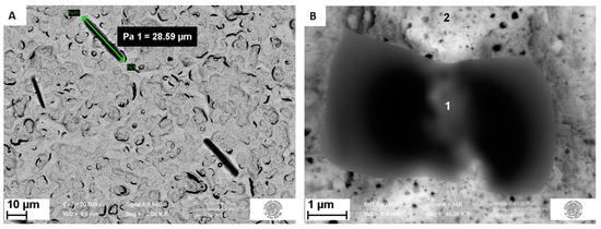 Examples of MIP heterogenous distribution after electropolymerization with the presence of polymer ‘islands-like’ aggregates. Overall distribution at 2.00 kx, with green arrow and label indicating the island length of about 28.6 µm (A). Zoom on a polymeric island at 40.00 kx, where the numbers indicate the EDS spectra acquisition points (EDS spectra reported in Supplementary Material Figure S6) (B). Both images were obtained using backscattered electrons.
