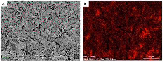 Examples of MIP heterogenous distribution after electropolymerization: image obtained with backscattered electron (BSE), 20.00 kV and a magnification of 2.00 kx (A) and the corresponding fluorine map (B), whose most intense areas are at the same locations as low Z island in BSE micrograph. This map was elaborated applying a smooth filter with kernel size 3 to the data collected by the detector.