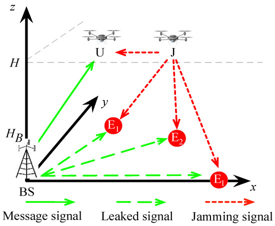 Currently, the UAV trajectory design combined with physical-layer security techniques, as a promising solution, has drawn significant attention to safeguard the UAV communication. Specifically, UAV secure communications are studied in [18,19], where the average secrecy rate is significantly improved via optimizing the trajectory of the UAV jointly with the power control for a finite mission duration. As cooperative jamming is one of the important physical-layer techniques that can enhance the secrecy performance, reference [20] proposed to employ a UAV as a friendly mobile jammer, to ensure the secrecy of the ground wiretap channel. In [21], a novel full-duplex operation was applied to the rotary-wing UAV to further improve the energy efficiency (EE) of UAV secrecy communications, and the EE was maximized by the joint optimization of the source transmit/UAV’s jamming power and UAV trajectory. A four-node mobile relay and eavesdropper system is proposed in [22], where the UAV was employed as a mobile relay to assist in terrestrial communications. To cope with the non-convex secrecy rate maximization problem, an alternating optimization algorithm is designed by optimizing the power control and UAV trajectory alternatively. The authors in [23,24] proposed a dual-UAV UATC network to enhance the communication quality and improve the secrecy performance, where the downlink transmission from the UAVs is established by adaptively adjusting the UAVs’ trajectories and transmit powers. Note that most of the above studies only focus on the security issues in UATC systems. However, how to design efficient anti-eavesdropping methods, to protect legitimate BS-to-UAV transmission in the CEUC networks, has not been investigated, and thus remains a challenging problem to address.