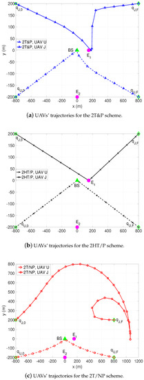 UAVs’ trajectories by different schemes for s. All trajectories are sampled every 5 s. The horizontal locations of the BS, eavesdroppers, UAVs’ initial and final locations are marked with ▲, ⚫, ☐ and ◇, respectively.