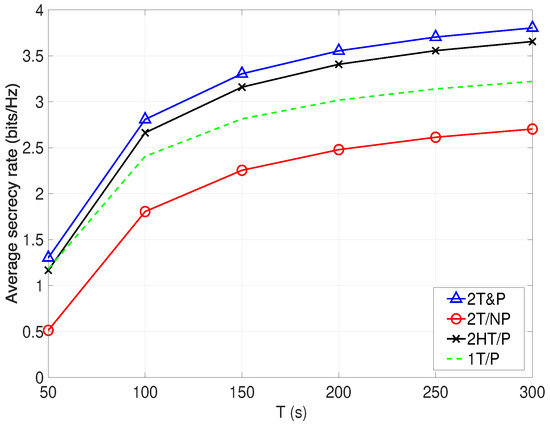 Figure 4 illustrates the average secrecy rate versus T. It is expected that the average secrecy rates obtained by all schemes raise with T, and the proposed 2T&P scheme significantly outperforms other benchmark schemes owing to its joint optimization. Moreover, the proposed 2T&P scheme provides the significant gain as compared to the scheme in [18], i.e., 1T&P. This indicates that the advantage brought by the aerial cooperative jamming is more effective and important on notably improving the average secrecy rate. However, the 2T/NP presents the worst performance, which demonstrates that the power control also plays a key role in avoiding jamming from other UAVs, which is necessary in our cellular-enabled UAV communication networks with aerial cooperative jamming; otherwise, the secrecy rate can be significantly degraded as shown in Figure 4. Note that we expect that the proposed 2T&P algorithm can still achieve the best secrecy performance via the joint design, even if the number of the eavesdropper increases. This is because the joint design guarantees that the eavesdropper with the best channel condition can be effectively jammed by the UAV J; other eavesdroppers cannot wiretap confidential messages from the BS. The obtained results validate the advantages of introducing aerial cooperative jamming, and the joint optimization of UAV trajectories and power allocations.