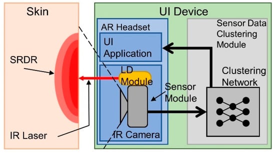 Deformation of human skin can be detected by measuring changes in the SRDR of IR transmitted underneath the skin. “Diffuse reflectance” (DR) is the ratio of the amount of flux reradiated by diffuse reflection, and its intensity is affected by the microstructure of collagen fibers distributed under the skin. “Spatially resolved” (SR) implies using the radial distance from a light incident spot [2,4,31]. Nickel et al. found that “Langer ’s line” [32], which indicates the collagen fiber distribution in human skin, follows the direction of measured SRDR of skin [4], and Cha et al. showed that the SRDR measured in relation to skin deformation mirrors deformation of the skin [5]. Cha et al. and Kim et al. applied IR diffusion reflectance to detect VR headset user’s facial expressions [33,34].