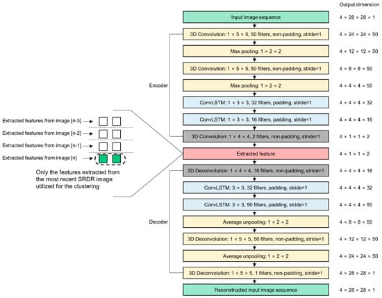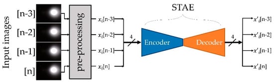 The autoencoder is a type of artificial neural network that learns the data representation in an unsupervised manner and typically is part of an encoder–decoder pair. The encoder is trained to compress the input data, while the decoder is trained to restore the compressed data to the original input data with minimum loss. In this context, the encoder was induced to learn data representations to reduce redundancy in the input data. As illustrated in Figure 6, the proposed STAE received four successive images as inputs from the preprocessing unit.