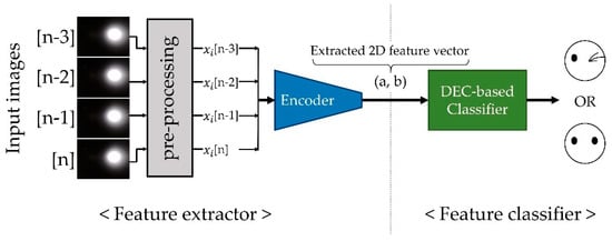 The camera of the proposed sensor converted user facial gestures into sequential NIR SRDR images. Those images were the data input to the classifier network, which decided whether the data implied a winking gesture. Image clustering is a promising method for image classification in an unsupervised way; however, this is still a hard task for the following two reasons. The first issue is the dimensionality of the input image data. Images are often of very high dimensionality, and this should be reduced to avoid the “curse of dimensionality” [37], which significantly affects the performance of a K-means algorithm. Another issue is that features in the images usually have 2D or 3D local structures, which should not be overlooked during the clustering. These features require kernels optimized to the shape of the local structures. Moreover, because the inputs from the sensor were sequential data, which may have temporal features, the proposed clustering network should be able to extract temporal features, as well as spatial information, from the inputs.