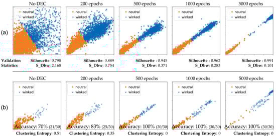 Figure 9a shows the clustered results of the proposed classifier network with the number of iterations with the DEC method. The network clustered a sequence of 81,758 training-set input images to verify the performance of the clustering process. Because the feature space of the classifier was two-dimensional, the clustering results were able to be represented in 2D feature space without any dimensional reduction visualization method such as t-SNE [41]. Colors and shapes of the dots indicate each cluster of neutral or winked states, and the name of the cluster is depicted in the legend of the scatter plots. Compared to the results obtained before DEC, the results after application of the DEC significantly improved the resolution of the cluster boundary as the learning epochs proceeded. However, we could not determine the accuracy of the clustering network because we used unannotated data for the feature extraction and DEC-based classifier. We applied an unsupervised learning method to the proposed classifier network, so there was no information to indicate whether a state was winked or neutral.