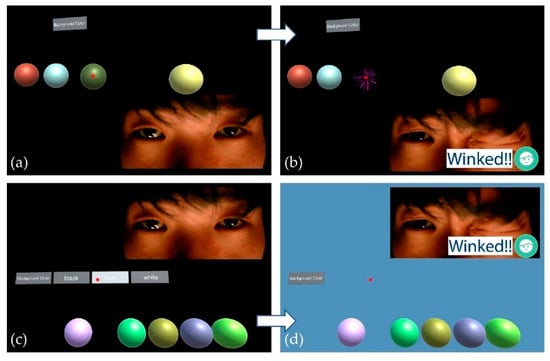 Screenshots from the demonstration using a custom-made application. A user could pop balloons (a,b) or select buttons to change the background (c,d). A user could select an object by aiming (targeting) a red center dot on a specific object and then execute using a winking gesture.