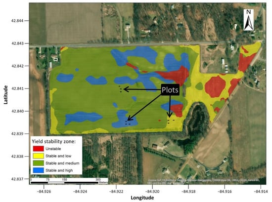 Geographical location of the commercial crop field and the plots established within three yield stability zones.