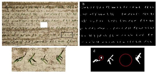 The accuracy of maize identification for all plots is shown in Table 1, and Figure 2 shows the UAV image and associated extracted maize plants in the third SH plot. All precision values were higher than 95%, indicating that less than 5% of maize plants were not identified. This may occur due to inappropriate thresholds on the ExG image or the two filters. For example, in Figure 2c,d, one maize plant was misclassified as background because its small size is less than the threshold setting in the first filter. Another case was highlighted in the left red circle, in which the fragmented segments of one maize plant were not merged due to a larger distance than threshold settings in the second filter. Recall values were 100% for most plots and 97% for the third SH plot and 99% for the second SM plot (Table 1). These FN cases are caused by the similar ExG values of weeds and shade on the maize, which often occurs during the field flight. Overall, these results highlighted the ability of UAV-based maize plant identification at the plot scale.