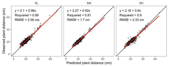 Figure 3 shows that all the coefficients of determination (R2) between measured and estimated plant distance were around 0.90, and the regression lines of SH and SM were parallel to the 1:1 line with intercepts close to 0. The averaged de was 1.7 cm for SH plots, 1.4 cm for SM plots, and 2.0 cm for SL plots, resulting in 75 percent of relative errors that were less than 10%. The slightly large error in the SL plots resulted mainly from uneven emergence rather than the assumed uniform crop height in the algorithm, which in turn affected the calculation of maize centroid locations. The global ExG threshold also introduced some uncertainties in characterizing maize plants; for example, some parts of leaves were classified as background (Figure 2c,d). This also caused inaccurate estimations about maize centroids. Nevertheless, we considered the estimation acceptable for testing our hypothesis.