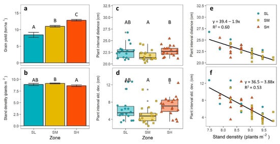 Grain yield (a) and plant stand characteristics (b–d) across plots in zones with stable-low (SL), stable-medium (SM), and stable-high (SH) yields. Error bars in columns indicate standard error of the mean. Treatments with same uppercase letters indicate that means are not significantly different to a Tukey mean comparison test (p < 0.05). Fitted linear relationship of stand density and mean plant interval distance (e) and standard deviation (f).
