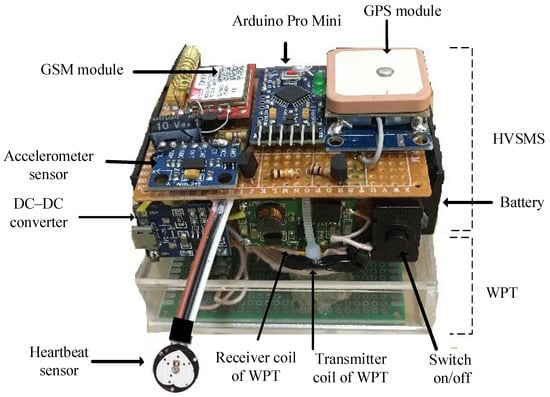 The GSM and GPS modules were chosen to be compatible with the Arduino board. Regarding the GSM module, a SIM800L board was adopted in this work, requiring 3–5 V DC supply voltage and consuming 350 mA of current during transmission of data. It has 88 pin pads of Land Grid Array (LGA) packaging, and all hardware interfaces are provided [46]. Concerning the GPS module, a NEO-M8N board was used. It has high positional accuracy, providing high sensitivity and a short acquisition time while maintaining a low-power system with a maximum current of 70 mA, and outputs the NMEA protocol [47]. Power consumption is a critical issue because health monitoring devices such as the proposed HVSMS are required to operate all day [48]. Figure 2 illustrates all components of the HVSMS with WPT.