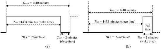 In the ON state, the ACC and HB sensors consume a specific amount of power, whereas both sensors go into a deep sleep in the OFF state when the patient is falling. In this case, and consume zero power. Consequently, Equation (4) can be shortened to Equation (5).