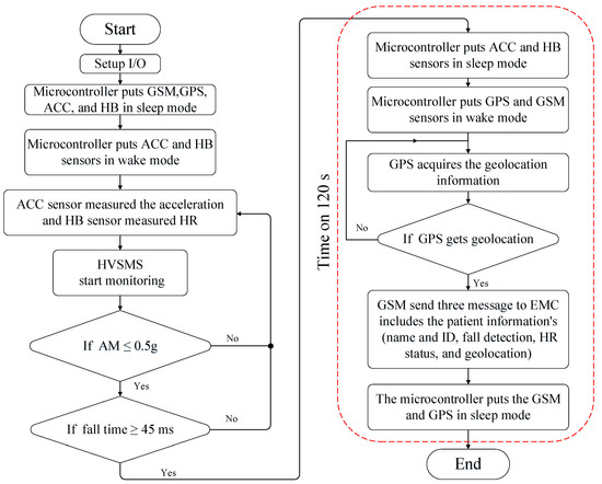 One of the most-used methods used for increasing power savings in WBSN applications has been sleep and wake algorithms [49]. Previous works adopting these algorithms have successfully decreased the power consumption of the proposed devices used in health monitoring systems [17,18,19,20,21]. However, in this study, a different approach relative to previous works was practically implemented by proposing an ON/OFF scheme-based event, termed a data-event (DE) algorithm running on a microcontroller such as an Arduino Pro Mini. This algorithm aimed to reduce HVSMS power consumption. Generally, the DE algorithm brings the main power-hungry components of the HVSMS (i.e., GPS and GSM) into a deep sleep (OFF state) until a patient fall event occurs. When a fall happens, the DE algorithm wakes these two components (turn on) to send an alert message within a short time to the EMC, and then returns them to deep sleep until another event occurs. As a result, the power consumption is reduced significantly. The operation of the DE algorithm is described in detail in the following steps: