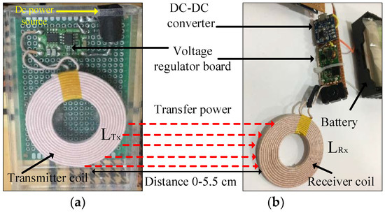 In this paper, two Li-ion batteries were used to supply the HVSMS with a voltage in the range of 3.7 to 4.2 V. The DC output voltage and current of XKT-412 were 5 V/1 A—this voltage value is higher than the voltage of the HVSMS battery. Therefore, a DC-to-DC step-down voltage converter was used to convert the voltage down to be consistent with the charging voltage of the HVSMS battery, as shown in the hardware diagram of the WPT, presented in Figure 6. The TP4056 board was used as a DC–DC converter [57] to convert the output voltage of the WPT (XKT-412) to 4 V. A simple experiment was conducted to measure the output voltage of the WPT module at different distances. The distance between transmitter and receiver coils was tested from 0 to 5.5 cm, with a distance step of 0.5 cm, until 5.5 cm was reached. The results of this experiment are highlighted in Section 6.