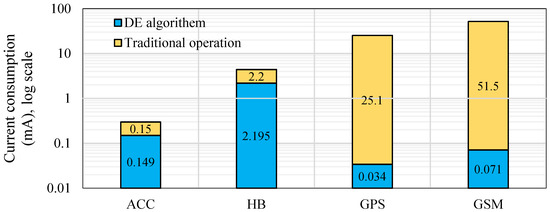 Once the DE algorithm was applied to the HVSMS, the power consumption was significantly reduced. Figure 8 illustrates the measurements of current consumption of each HVSMS component before (i.e., traditional operation) and after applying the DE algorithm. Based on the DE algorithm, the average current consumption for each component was developed to 0.149, 2.195, 0.034, and 0.071 mA. Consequently, the overall average current consumption was reduced to 9.35 mA relative to traditional operation (i.e., 85.85 mA). Figure 8 reveals that the GSM and GPS came in first and second, respectively, for consuming power in traditional operation. However, when the DE algorithm was applied, the power consumption was considerably reduced. This reduction in power consumption can be attributed to the GPS and GSM being in the OFF state most of time (before patient fall) and in the ON state for only a fraction of time (after patient fall occurs to transmit their information). On the other hand, there was a slight difference in power consumption in ON and OFF states of the HB and ACC sensor because they were in the ON state (before patient fall to measure and monitor the heart rate and fall) most of the time and in the OFF state (after patient fall) for only a fraction of time.