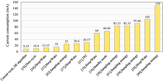 The power consumption of the proposed HVSMS using a DE algorithm was compared with the current drain of other systems outlined in existing studies [16,17,18,19,20,21,24,37,38,39,40,41,42] on patient vital signs monitoring systems (Figure 10) to confirm the proposed HVSMS. The performance of the current work in terms of current drain was accomplished by relying on the designed system in Section 3 and was confirmed by the implementation prototype (Section 3) and proposed DE algorithm in Section 4, and current consumption modeling (Section 5) and current measurements (Section 6.1). The proposed DE algorithm was compared with the existing related articles on the basis of the values documented during measurements in the previous studies. The performance of the previous techniques is presented in Section 2 in terms of current consumption.