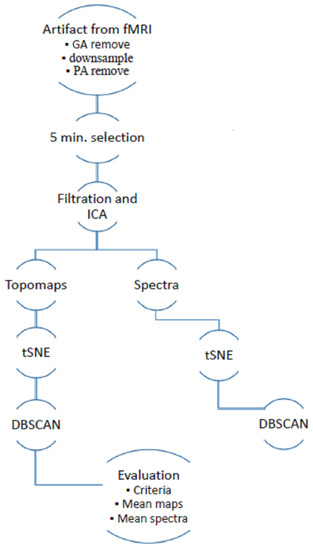 Data acquisition was approved by the local ethical committee of the National Institute of Mental Health, Czech Republic. All subjects involved in the study signed an informed consent form. Data were recorded using a Siemens Prisma 3T, EGI256-channel EEG system equipped by a Net Amps 400 series amplifier, Hz, DC coupling with 256 HydroCel Geodesic Sensor Net and Net Station 5 acquisition software. The method was implemented in the framework of the FieldTrip software toolbox (version 20181231) and SPM8 (version April 2009) in MATLAB 2015a [13,17]. The data processing schema is shown in Figure 1. The implemented methodology is based on previous research on artifacts with non-simultaneously recorded EEG [15] and includes an extension of a temporal–spatial–frequency evaluation.