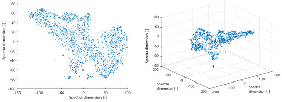 Reduced space of spectra to 2D from independent components (ICs) after using the t-distributed stochastic neighbor embedding (t-SNE) method with a perplexity of 30 (left). Reduced space of spectra to 3D from ICs after using the t-SNE method with a perplexity of 30 (right).