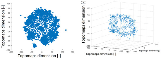 Reduced space of topomaps after using the t-SNE method to 2D space (left). Reduced space of topomaps after the using t-SNE method to 3D space (right). In both examples, a perplexity of 30 was used.