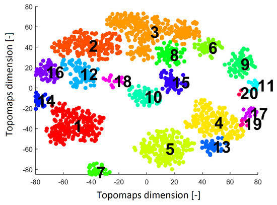 All 20 topomaps representing 20 determined clusters (using a perplexity of 30 or 40) are presented in Figure 7. All 11 topomaps representing 11 clusters determined after using t-SNE with a perplexity of 20 are depicted in Figure 8. Clustering with t-SNE with the perplexity set to 20 did not present any extra benefit compared with a perplexity of 30. For this reason, we focused on a t-SNE perplexity of 30.