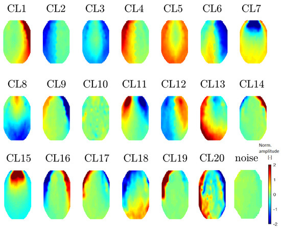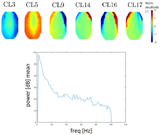 EMG artifacts (muscle artifacts) are manifested across the spectrum and topographic maps corresponding to individual narrower spectral values of muscle activity have a variable character [26,27]. It follows from Reference [28] that the shift of activity moves from the frontal to the occipital area for higher frequencies. EMG artifacts are reflected by higher power, especially in the edge electrodes [26]. Clusters CL3, CL5, CL9, CL14, CL16 and CL17 (see Figure 10) correspond to the definition of an EMG artifact. There is an apparent transition of activity from the frontal to the occipital area. The topomap in clusters CL3 and CL5 contain dominant muscle activity that could be caused by mastoidea or ear movements.