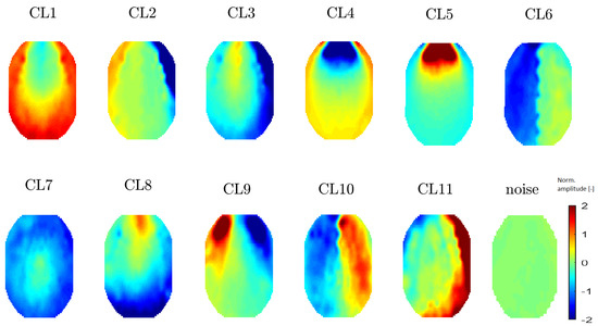 A topomap of an ECG artifact (artifact that represents heartbeats) is shown in Reference [24]. In this study, the ECG topomap is represented by descending performance across the head. Cluster CL18 has a similar topomap character.