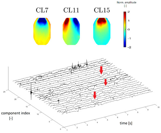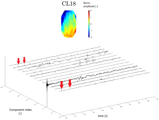 Topomap of cluster CL18 representing an electrocardiographic (ECG) artifact (top). Time-series graphs of a 10-second section of the signal clustered into the same cluster by IC topomaps. The arrows indicate an example of the ECG peak residuum, which manifested in the time-series graphs.