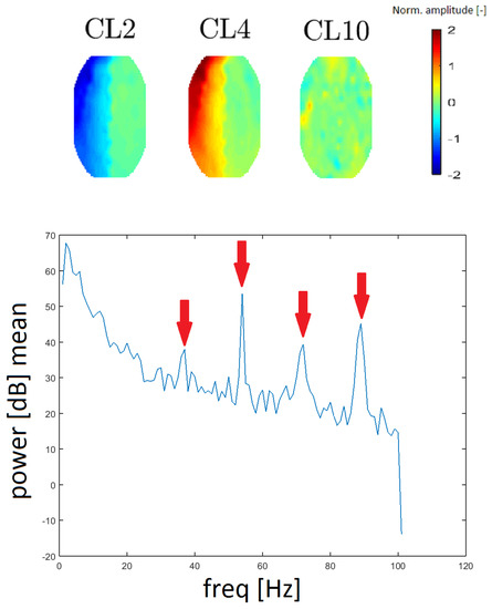 A gradient artifact (GA) is an artifact from the gradient coil of the fMRI. A GA has a periodic character in the spectrum; it resembles a “rake”, with an initial peak at low frequency (15–20 Hz), followed by its higher harmonics (see Reference [16]). GA residues were found in the spectra that correspond to clusters CL2, CL4 and CL10. We evaluated the spacing of individual local maxima in the power spectrum and we found that the spacing was constant at 18 Hz between higher harmonic frequencies. In this case, the spectrum was computed without median filtration because the spectral lines representing the GA are narrow.