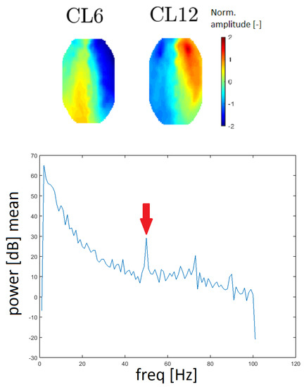 Line noise is an artifact caused by the socket of electrical outlets (with a frequency of 50 Hz in Europe). Two clusters, CL6 and CL12, had a very distinctive peak at that frequency in the spectrum and they also had similar topomaps (see Figure 13). In this case, the spectrum was computed without median filtration because the band of a line noise artifact is very narrow.
