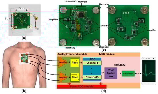 We designed the WFEES module to record six channels of single-lead ECG signals. Each permutation of two electrodes can be seen as a single-lead channel. That is, there were six single-lead channels, and the ECG signal obtained from each channel was the difference between the two electrodes. Figure 1 showed a simplified diagram of the WFEES module. It illustrated how the six single-lead channels were arranged and their orientation. The system could record six-channel ECG data at the same time, with two horizontal, two vertical, and two diagonal leads. The system overview was shown in Figure 2. Figure 2a presents the appearance of the WFEES system. Previous studies proved that a 5 cm distance between electrodes could provide a reliable ECG signal [18,22]. Thus, the distance between the two electrodes was set to 5 cm. Figure 2b illustrates how the WFEES module was worn on a test subject in one location. The system was attached to the subject’s body using four disposable Ag/AgCl electrodes. The front and back views of the circuit board are shown in Figure 2c. The system architecture of the hardware is shown schematically in Figure 2d.