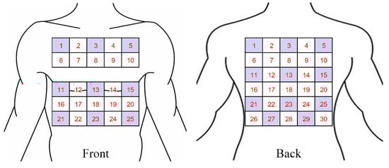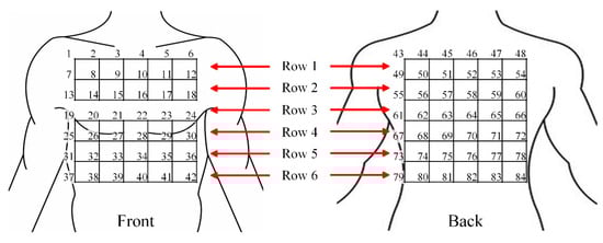Previous studies showed that a 5 cm distance between electrodes provided an acceptable SNR [16,24], and 30 to 32 electrodes were sufficient for recording ECG signals [25]. According to the average size of a Chinese adult [26], the average shoulder breadth is 37 cm and the hip breadth is 30 cm on average. Accordingly, we arranged 42 electrode locations on the front and back side of the human torso, respectively, marked uniformly with numbers from 1 to 84 in our study, as shown in Figure 3. Each pair of numbers represented a location and orientation of a channel. Every four adjacent electrodes formed a square with a side length of 5 cm, to which the WFEES module could be attached. Due to the physiological structure of the body, the front side of the torso may not be a plane. So we optimized the squares for better adaptation to the human body, as the squares of row 3 were only arranged on the back side of the torso, for later ECG data analysis. As a result, there were 25 squares and 30 squares on the front and back side of the human torso, respectively. The WFEES modules could be mounted on those squares, and we could record a set of six single-lead ECG data from each module.