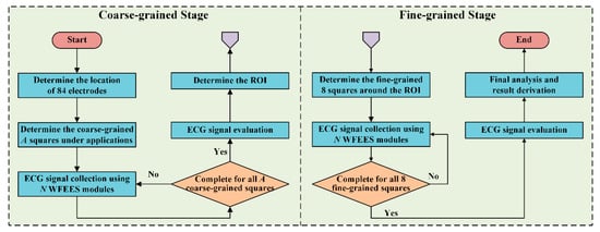 To reduce the ECG investigation complexity using the WFEES modules, we proposed a novel layered (A, N) square-based method, i.e., LANS method, which included two stages, i.e., the coarse-grained stage and the fine-grained stage. Here, the “A” in LANS stands for the Application-based coarse-grained requirement, in order to find the region of interest (ROI) for a certain ECG application efficiently; and the “N” stands for the Number of WFEES modules, which also represents a tradeoff between experimental time and space for ECG research. The process of the coarse-grained stage and fine-grained stage is revealed in Figure 4.