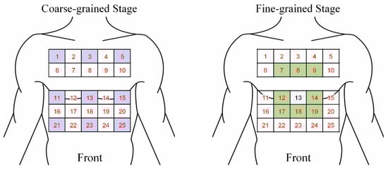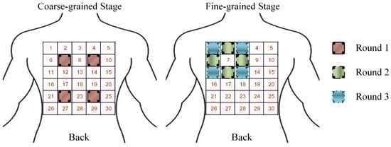 In the coarse-grained stage, we selected several squares, i.e., A squares, of which the locations were determined by different applications of ECG research. By computing the differences between signals from any two electrodes, a total of N WFEES modules could record N sets of six-channel ECG data simultaneously for all A squares with ⌈A/N⌉ rounds, where the “⌈ ⌉” symbol referred to the ceiling function; thus, A × 6 single-lead ECG data could be collected during the coarse-grained stage. The schematic diagram of squares for the front and back side of the human body is given in Figure 5. Note that the LANS method contained the following fine-grained stage to collect ECGs around coarse-grained A squares, so these A squares should not be adjacent. Therefore, the maximum value of A was 20, of which the locations are shown as the dark areas in Figure 5. The ECG data of the coarse-grained stage were then processed and evaluated, so the square, of which the ECG signals were relatively better than others for a predetermined purpose, i.e., ROI, could be determined.