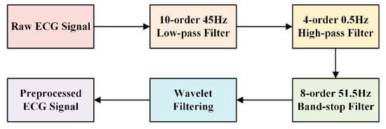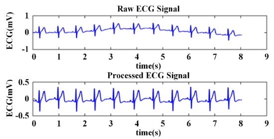 Although the ECG data collected by the WFEES module were passed through the hardware filter, there was still some interference affecting the quality of the signals. Baseline wandering caused by individual movement or breathing may induce a notable drift trend in raw ECG data. Consequently, we used the infinite impulse response (IIR) Butterworth filtering and wavelet filtering method to process the raw ECG data, as shown in Figure 8. After the IIR filtering, an eight-layer “bior3.5” wavelet decomposition was applied on the raw ECG data sets [27]. The baseline wandering and the low-frequency noises were eliminated by setting the level 8 approximation coefficients to zero. Other high-frequency noises were eliminated by thresholding the detail coefficients. Figure 9 presents the performance of ECG preprocessing. The ECG signal became smooth and stable for further feature extraction.